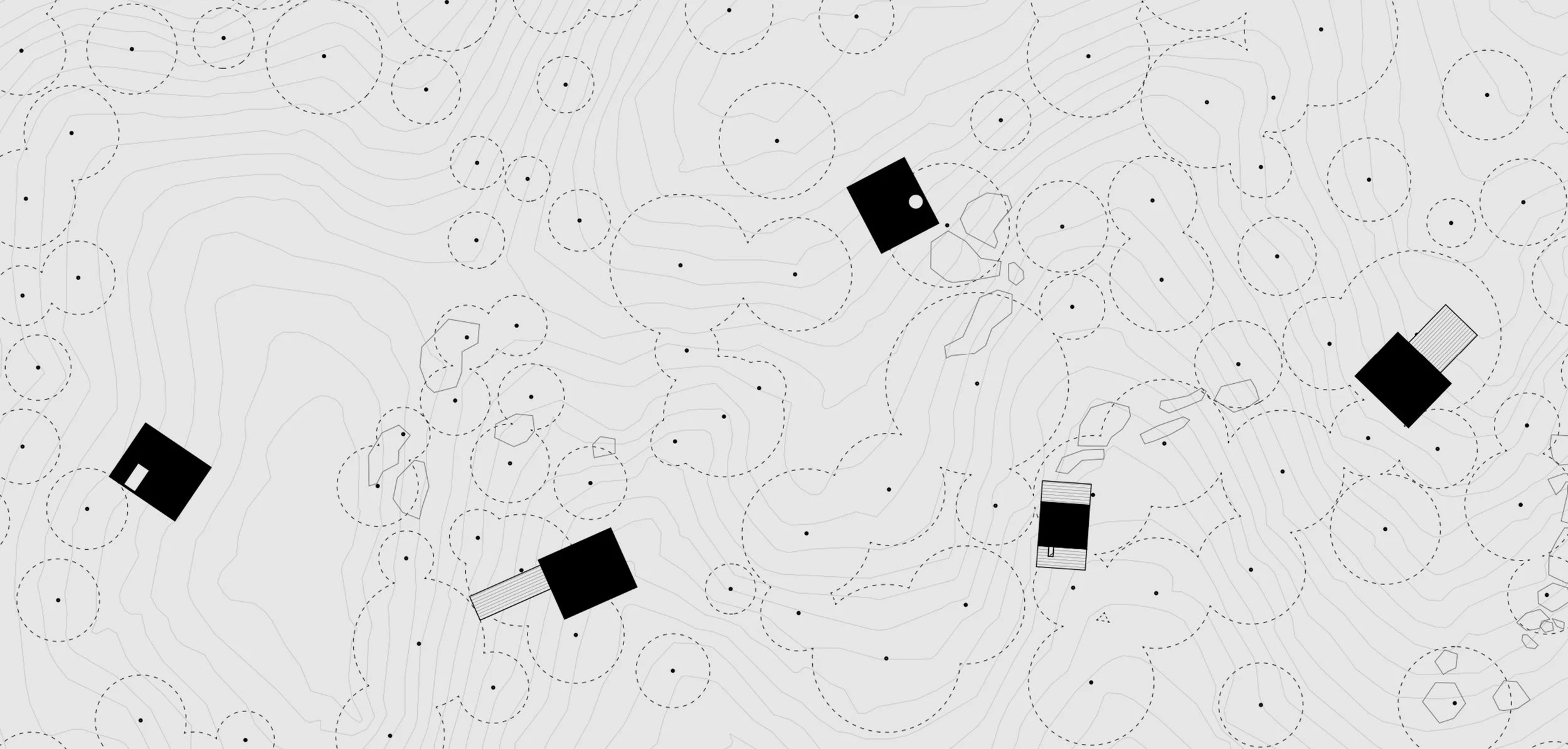 Among Trees is a project located near Atlanta in Georgia(US). It is part of a larger masterplan that involves the designing of a variety of buildings in a larges forested plot of land. This portion of the masterplan, titled Among Trees, envisions the creation of 5 cabins nested within a more densely forested area on the southern end of the plot.