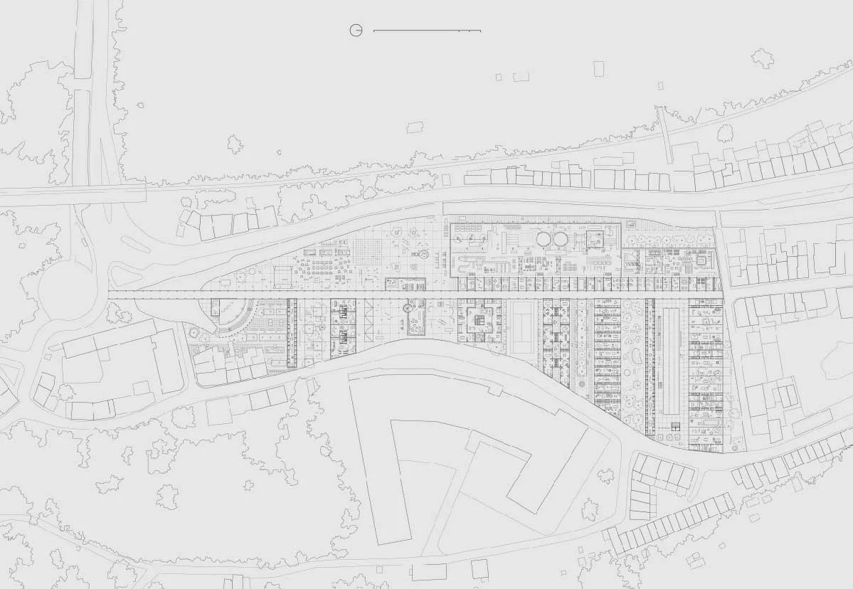 The eastern half consists of a series of mixed residential typologies. Semi-detached, terraced, apartment housing, and dormitories. Programs pertaining to the function of life outside of traditional work hours exist between them; sports facilities, parks etc. The western half, contains working spaces of different scales, from individual units to more collective working areas. These are subdivided from the existing foundry building. To the south of the foundry, there will be a large open square that acts as an event space for the district.